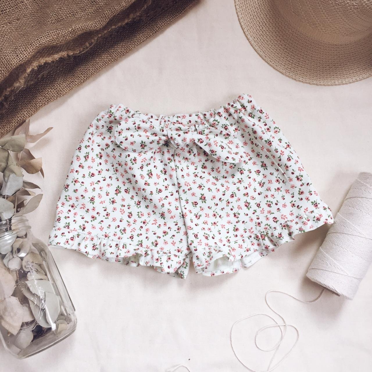 Short nena confeccionado en gabardina super suave estampada con volados y lazo.