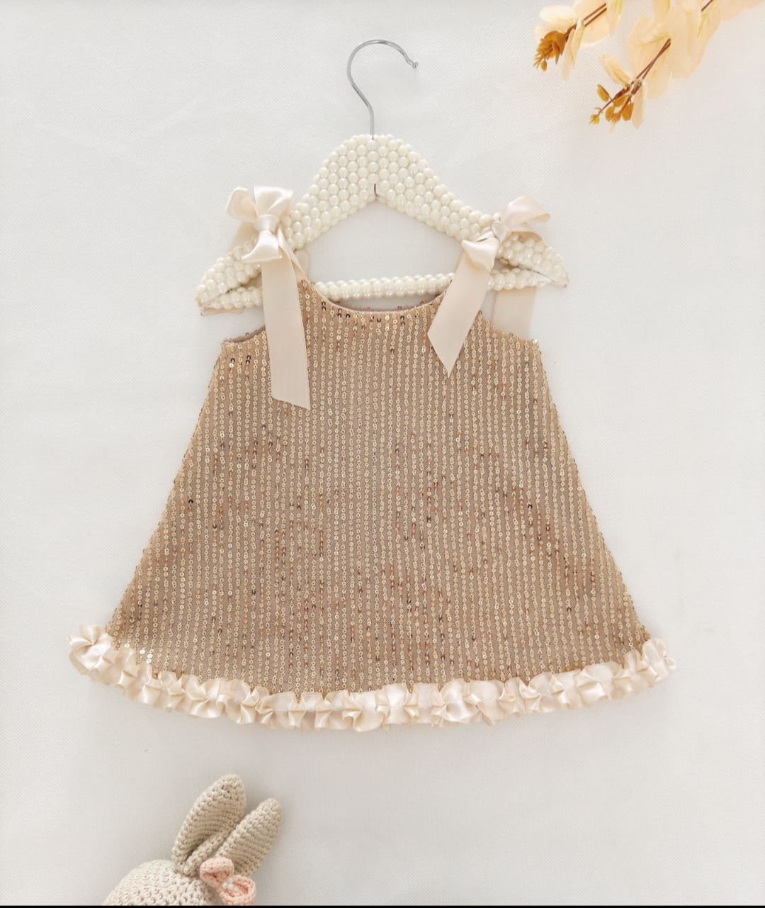Este hermoso vestido de lentejuelas viene con cintas de raso en los hombros que se atan en lazos para regular su altura y tiene un pequeño volado en el ruedo realizado en el mismo raso. Está confeccionado en una tela elastizada y forrado para que no molesten las lentejuejas contra la piel.