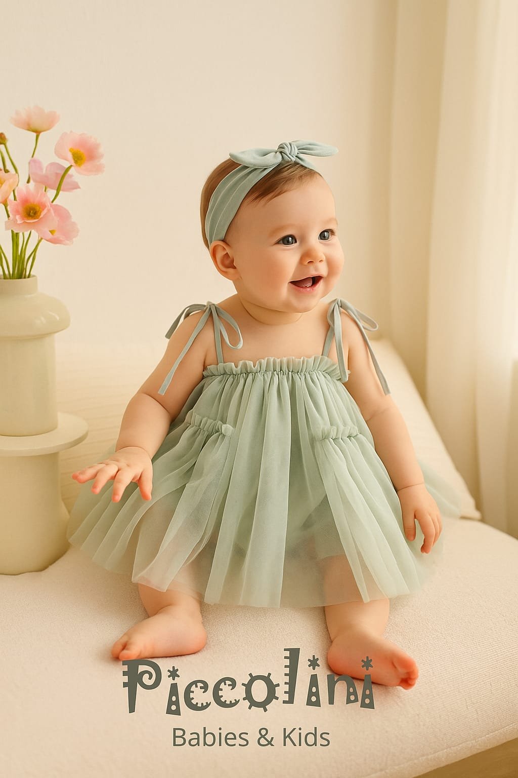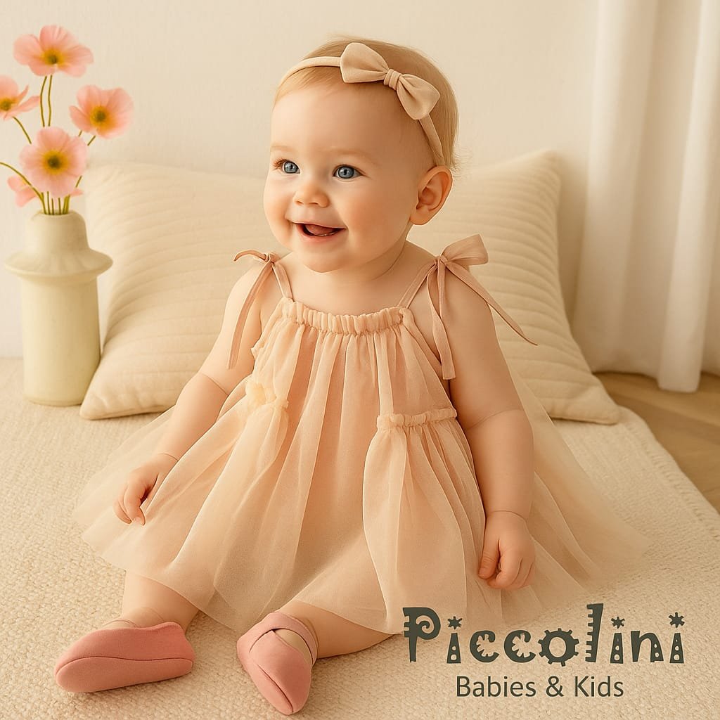 Hermoso solero de beba, con lazos de raso como breteles, confeccionados con varias capas de tul de polyester. Preciosos para fiestas y grandes eventos en verano.
