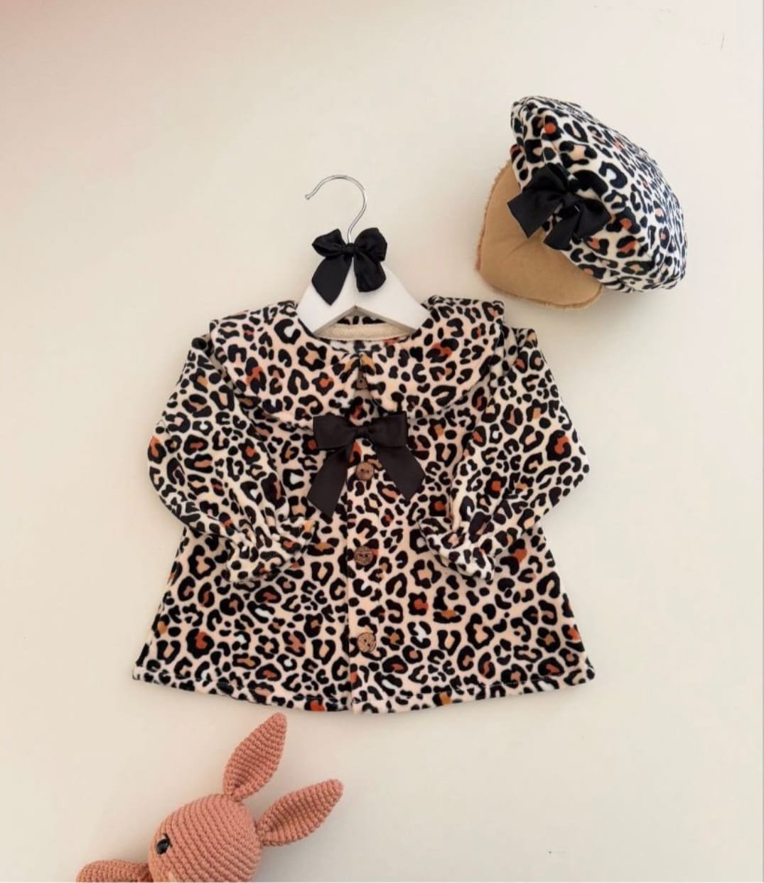 Tapadito de beba confeccionado en paño super suave con cuellito, botones imitación coco y moño en la espalda confeccionado en el mismo material. Viene con la boina haciendo juego