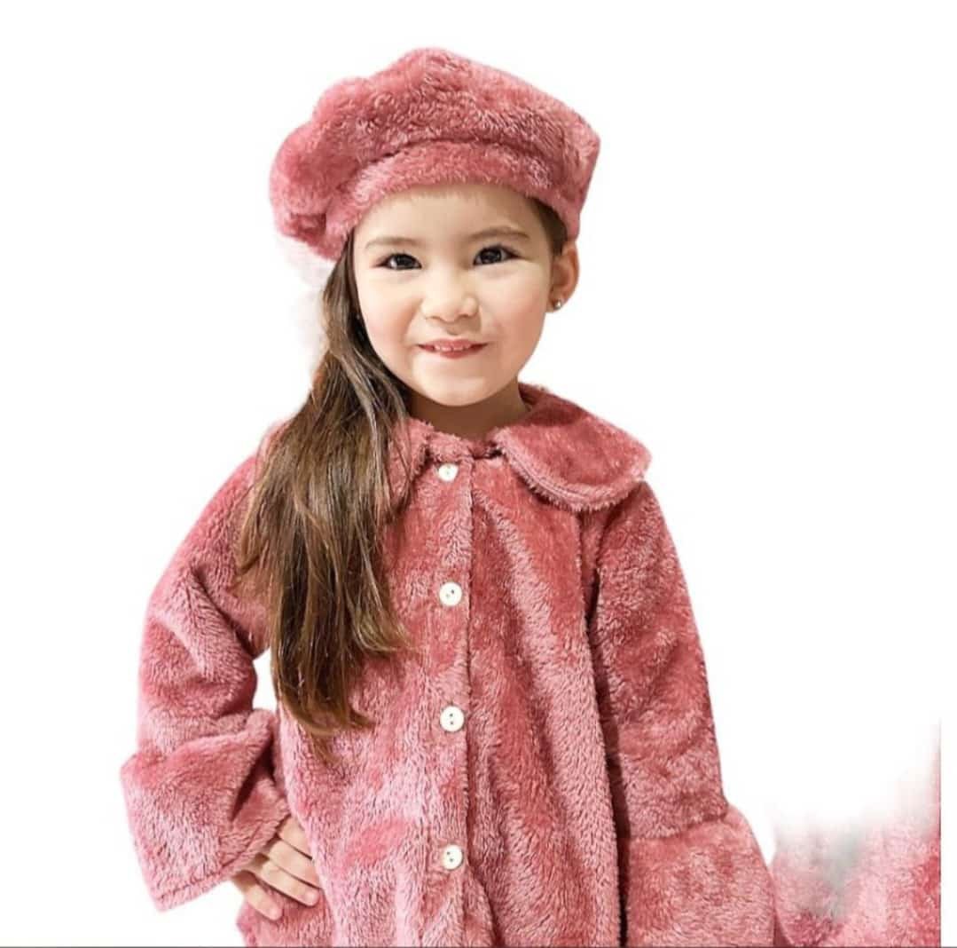 Tapadito de beba confeccionado en polar soft de pelo largo, forrado, con botones y boina confeccionada en el mismo material
