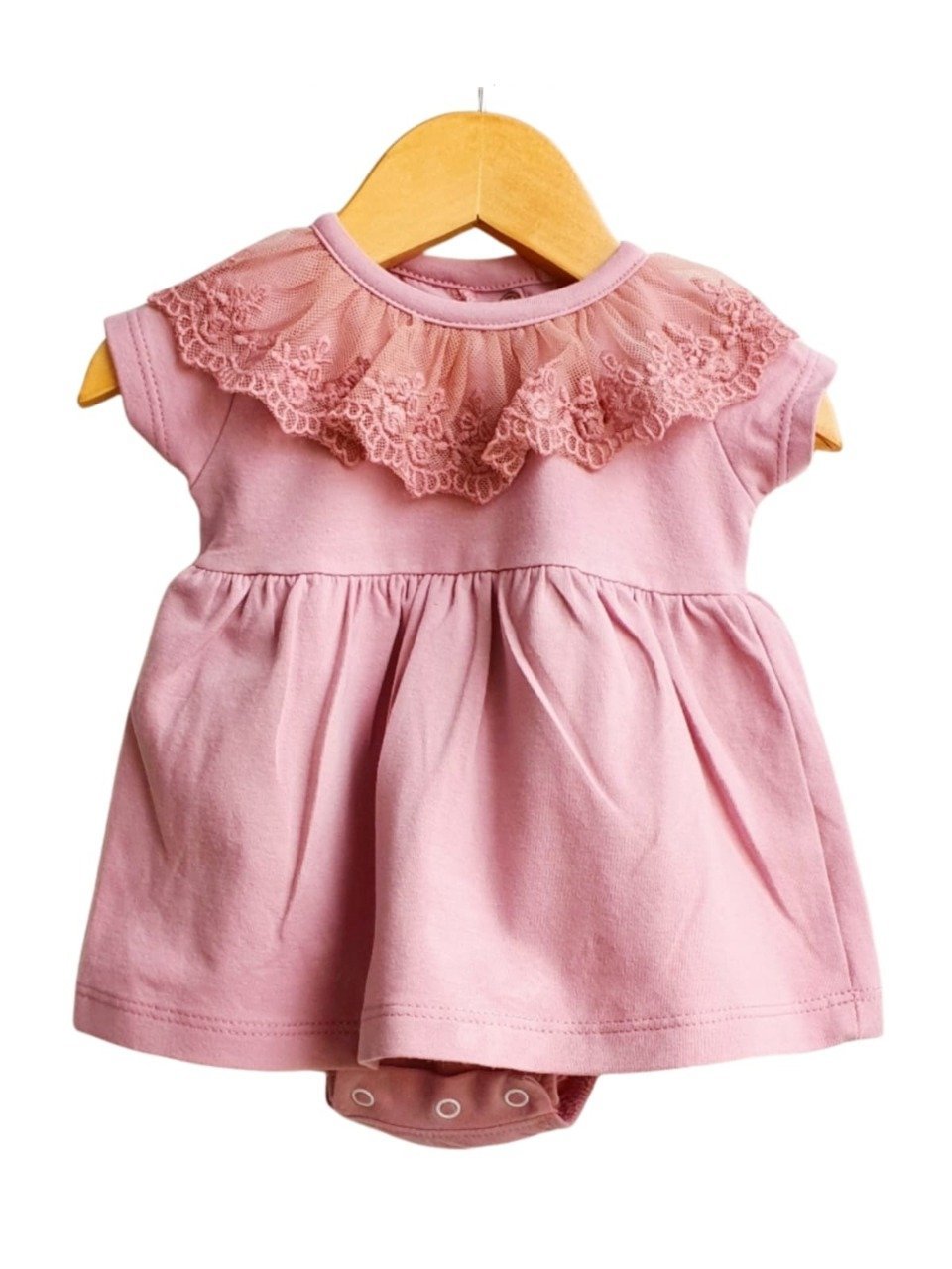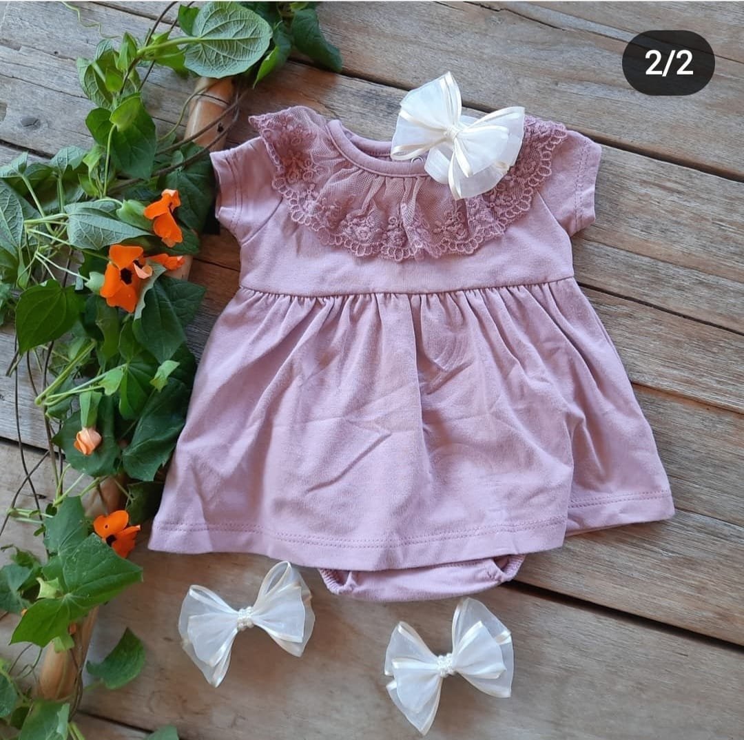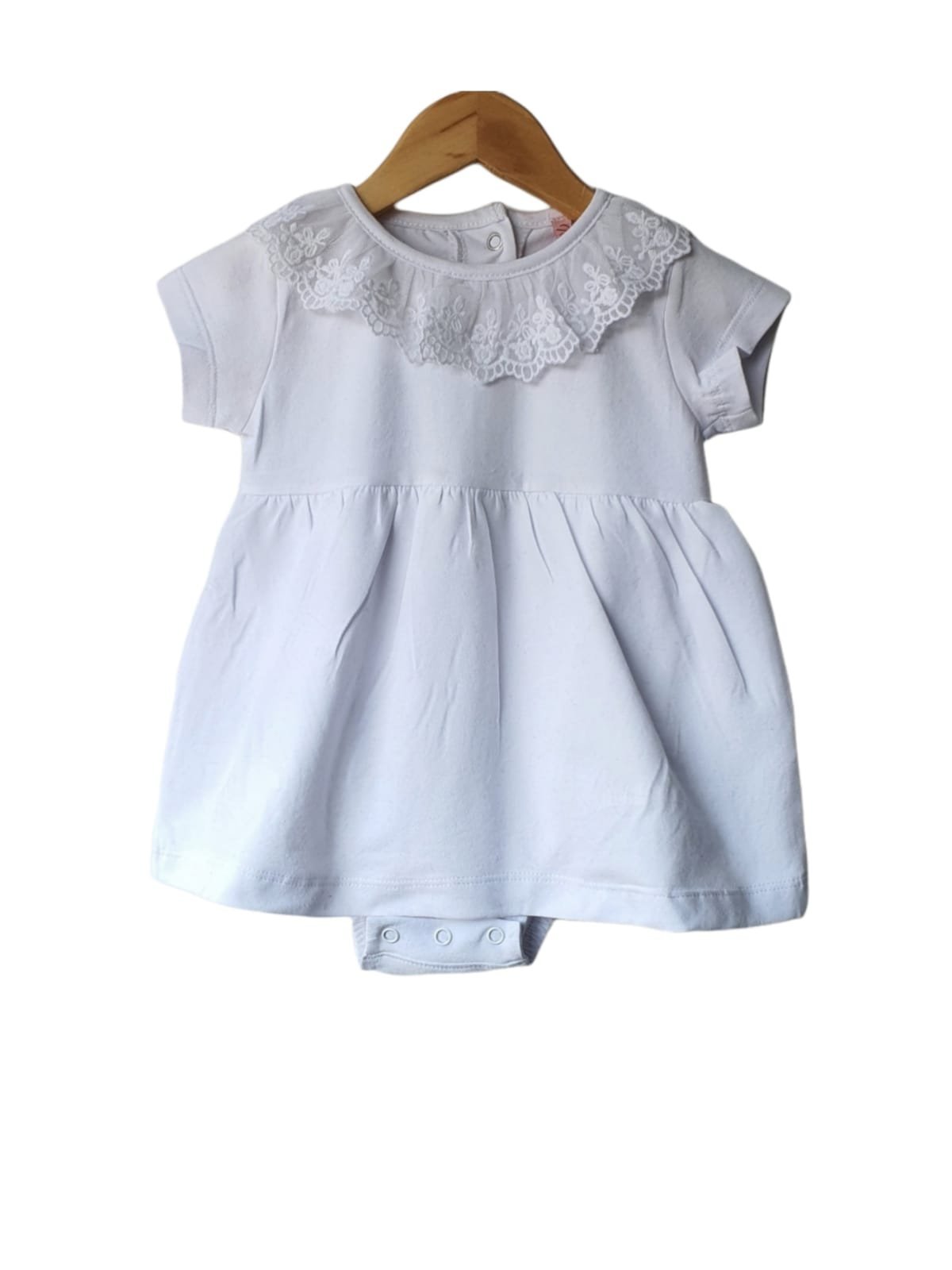Delicado vestido confeccionado en jersey de algodón 94% y elastano 6%. Con cuellito de broderie, botones en la espalda y 3 broches pañaleros. Trae un body interno en la misma tela.