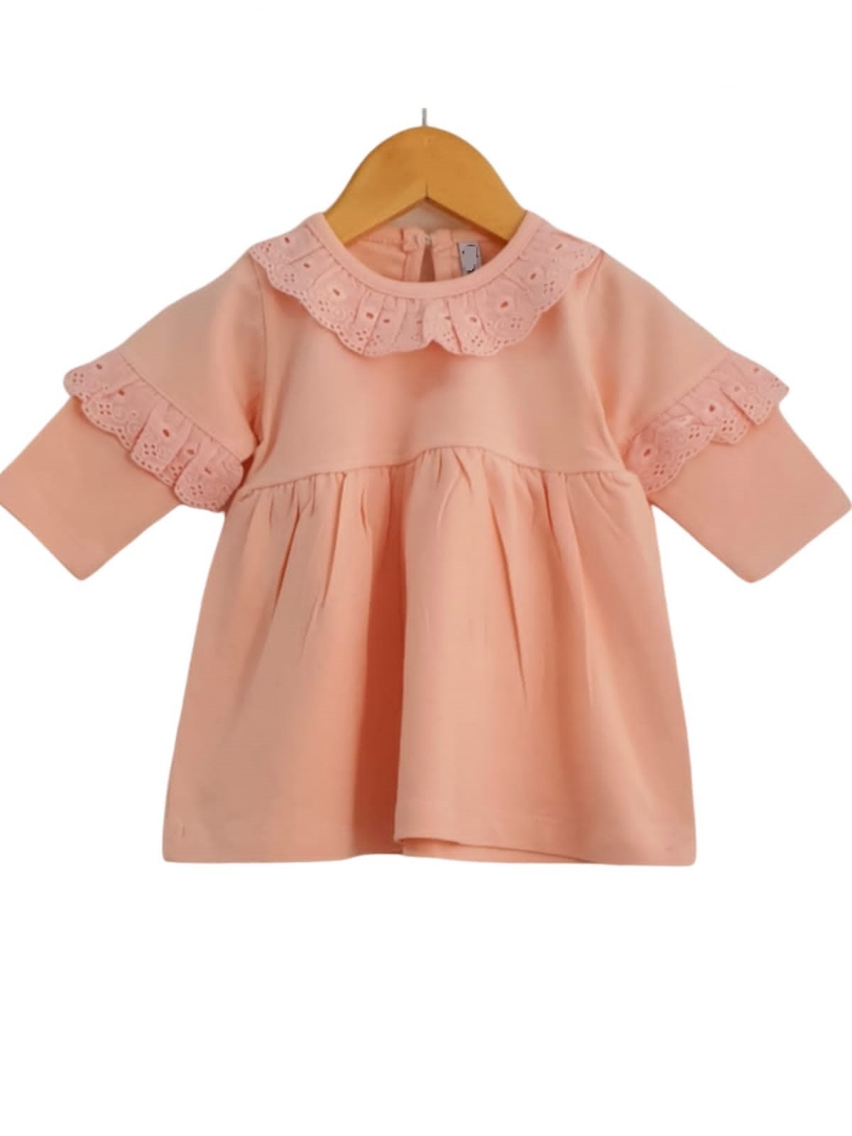 Este hermoso modelo es suave y elastizado, viene con volados de broderie al tono en el cuello y mangas, moñito al tono en el cuello, y carterita para abrir en la espalda.