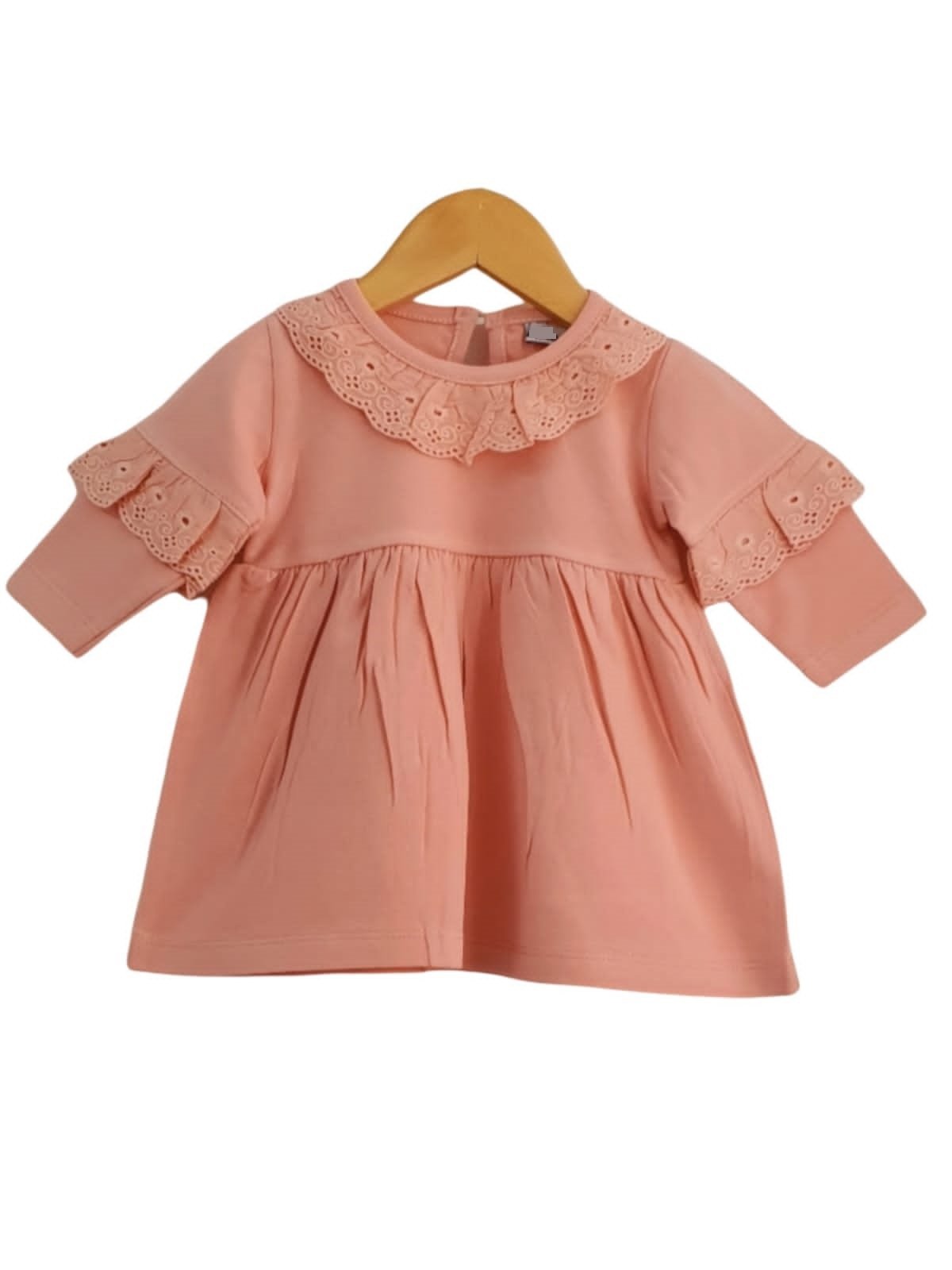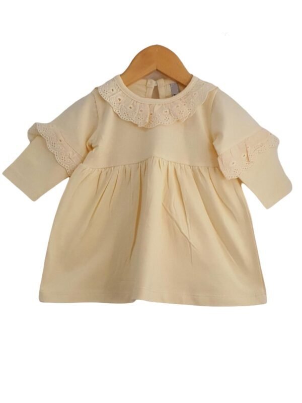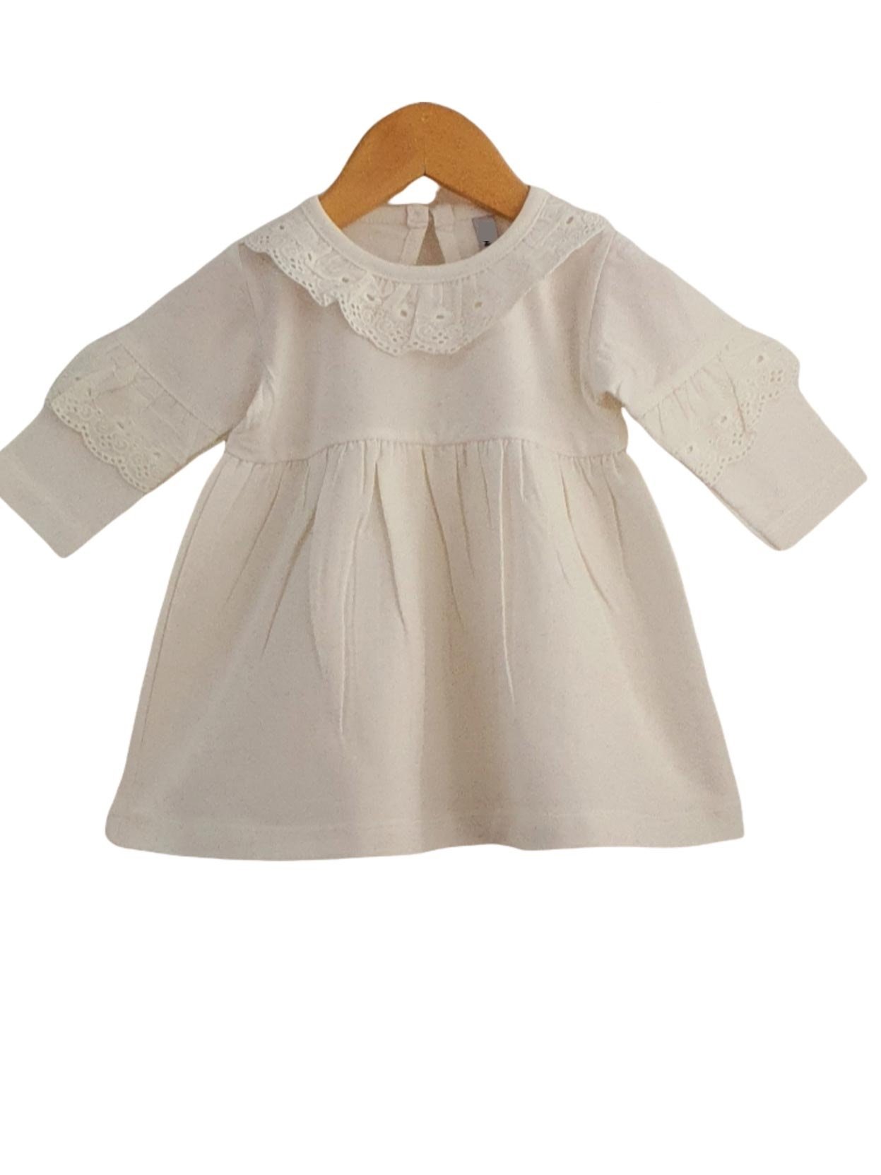 Vestido de beba, modelo confeccionado en jersey 92%, algodón peinado 6% lycra y 2% elastano.